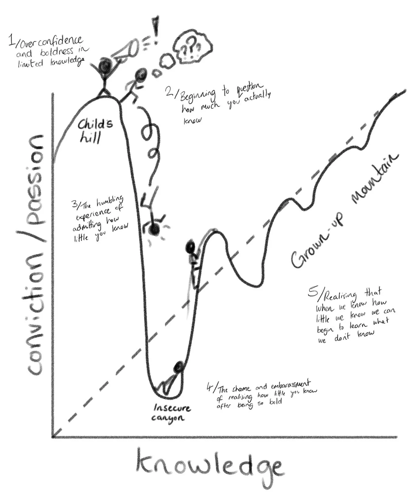 The Dunning-Kruger effect is a cognitive bias where individuals with limited knowledge or competence in a particular area overestimate their own abilities (typically due to a high level of enthusiasm, passion, or conviction. In contrast, those with more expertise often underestimate their capabilities, aware of how much they don't know, after all, knowledge of what we know make it apparent that there is much we do not know. Practically we see this phenomenon can lead to overconfidence among novices and humility among the truly skilled, we see this in the humility of a PhD student, and the boldness of first year undergraduate. The trick, I have found, is maintaining enthusiasm, passion, and conviction in the bold, while also generating sufficient humility to allow growth to occur